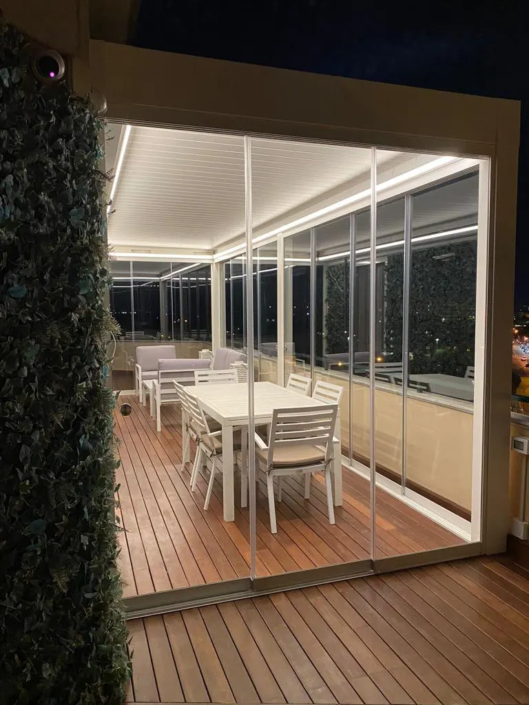 Il suo uso ideale è per la separazione degli spazi domestici o in aziende, ristoranti, locali e portici. I pannelli si muovono per mezzo di carrelli sul binario guida.