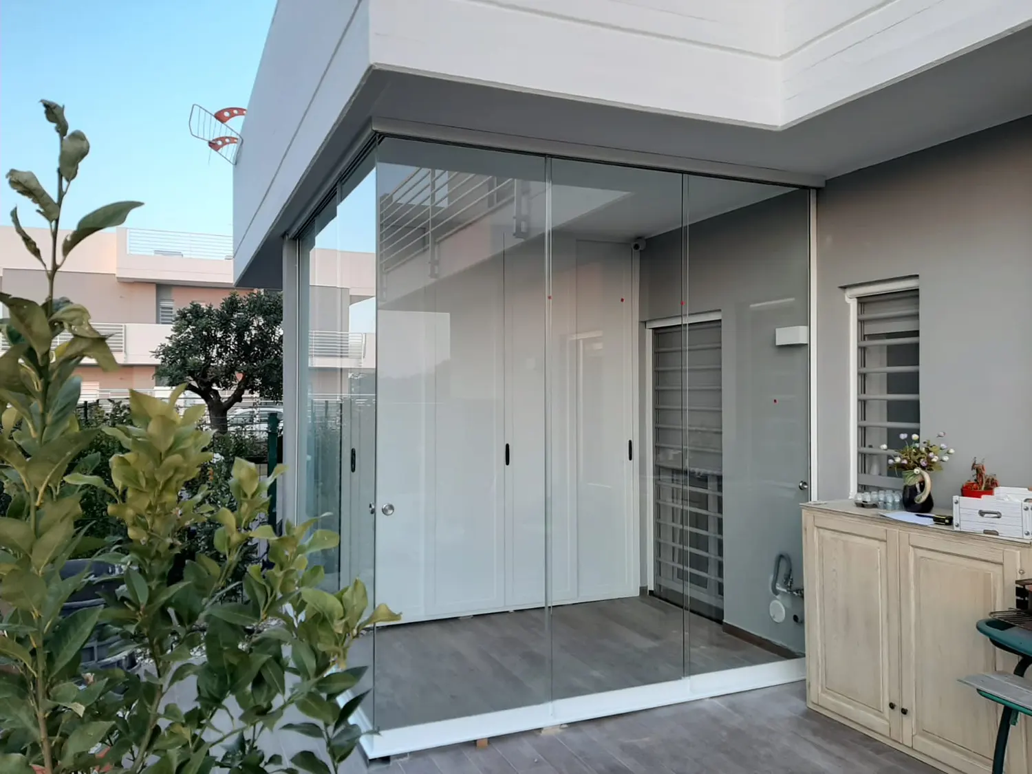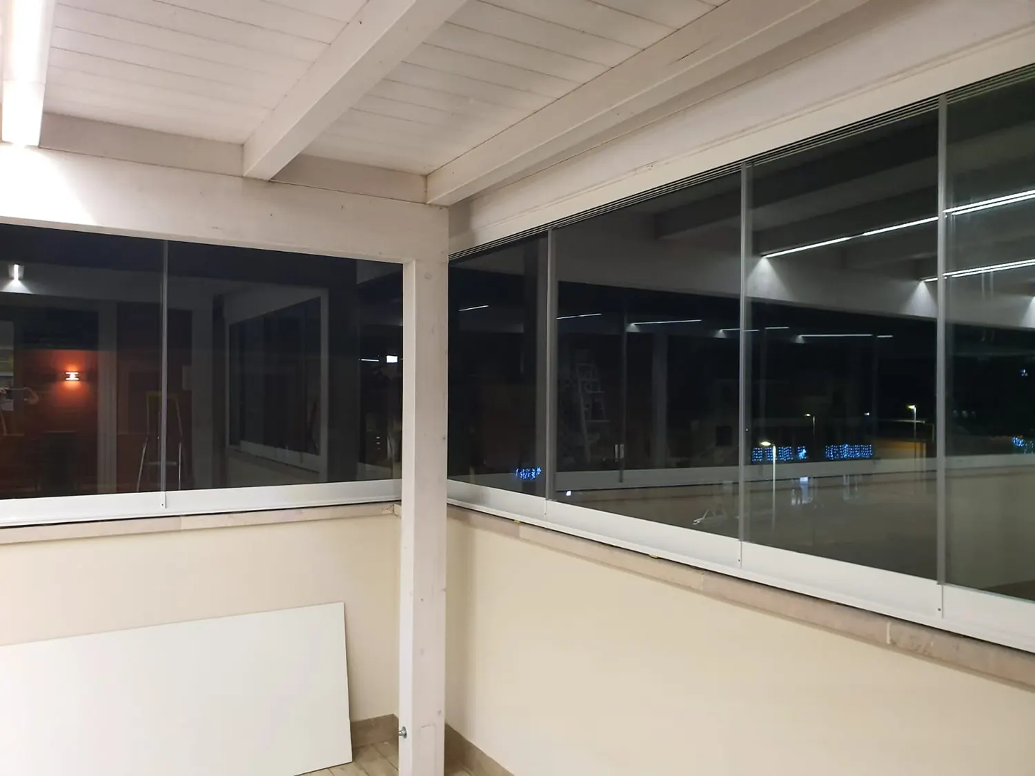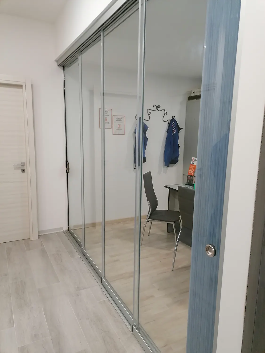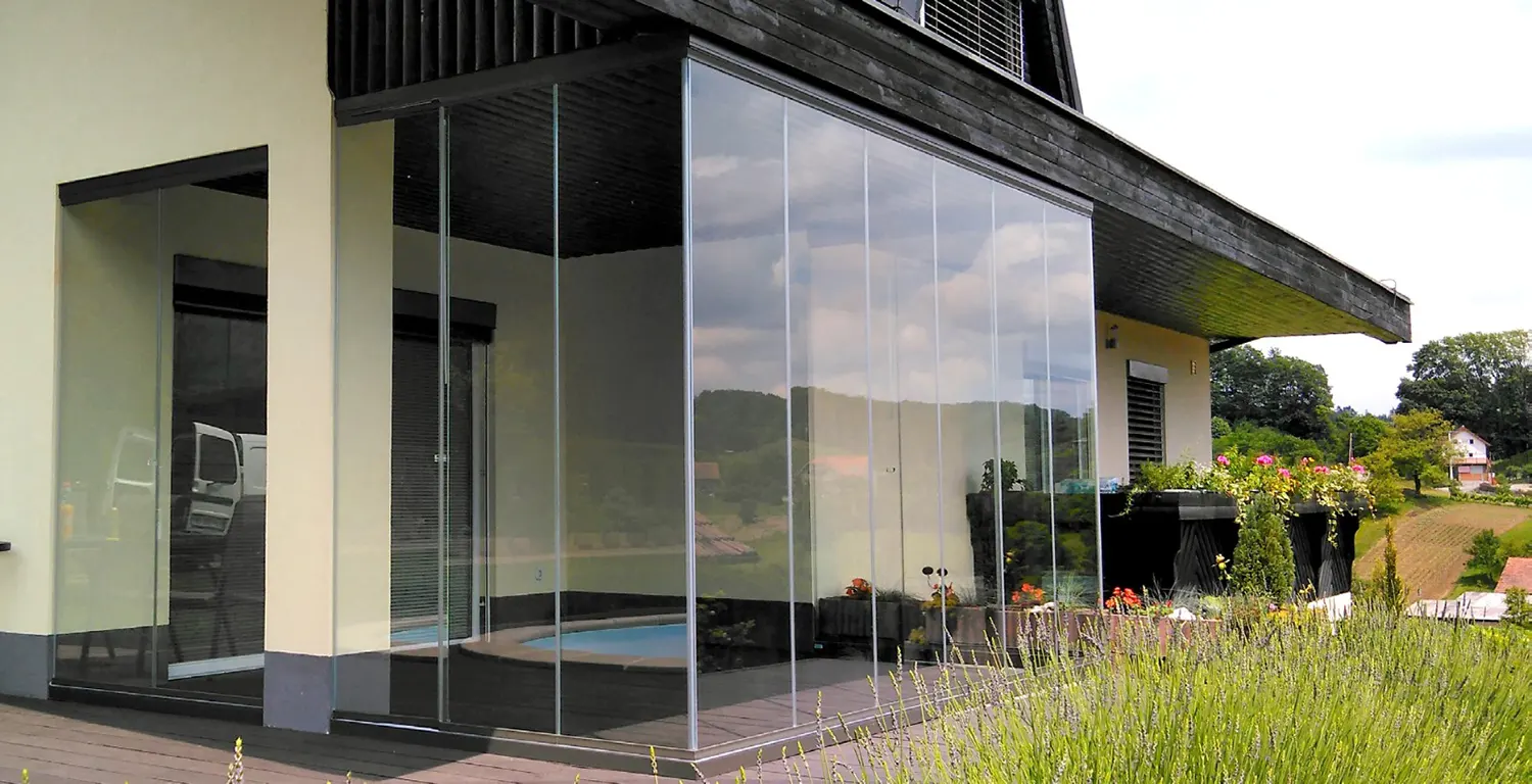 Si tratta di un sistema scorrevole di ante in vetro senza profili verticali che sostengono il suo peso sulla parte inferiore e scorrono orizzontalmente permettendo la rapida e semplice separazione degli spazi.